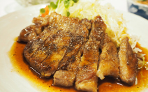 分厚い豚肩ロースのステーキに生姜たっぷりのオリジナル絶品ソースをからめると口いっぱいに肉の旨味が広がります。